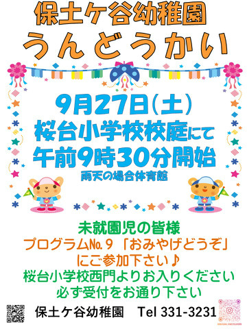 個別に掲載しているものもありますが、今後の行事(未就園の方が参加出来る)をお知らせします。